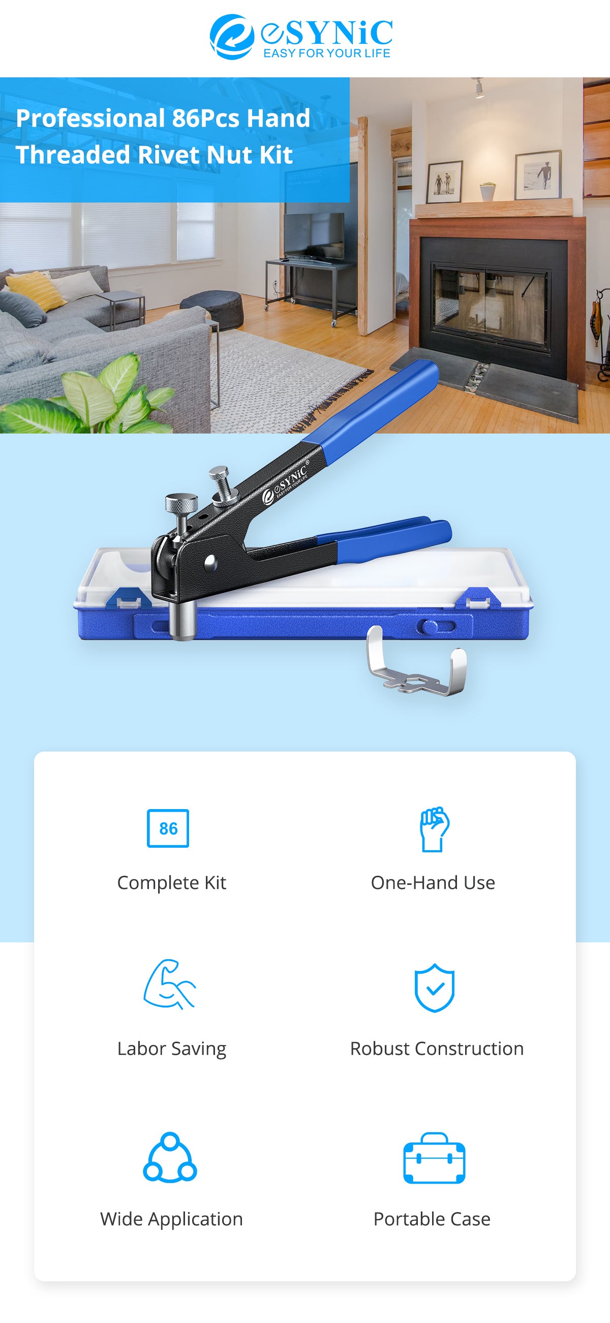 eSynic Professional 86Pcs Hand Threaded Rivet Nut Kit